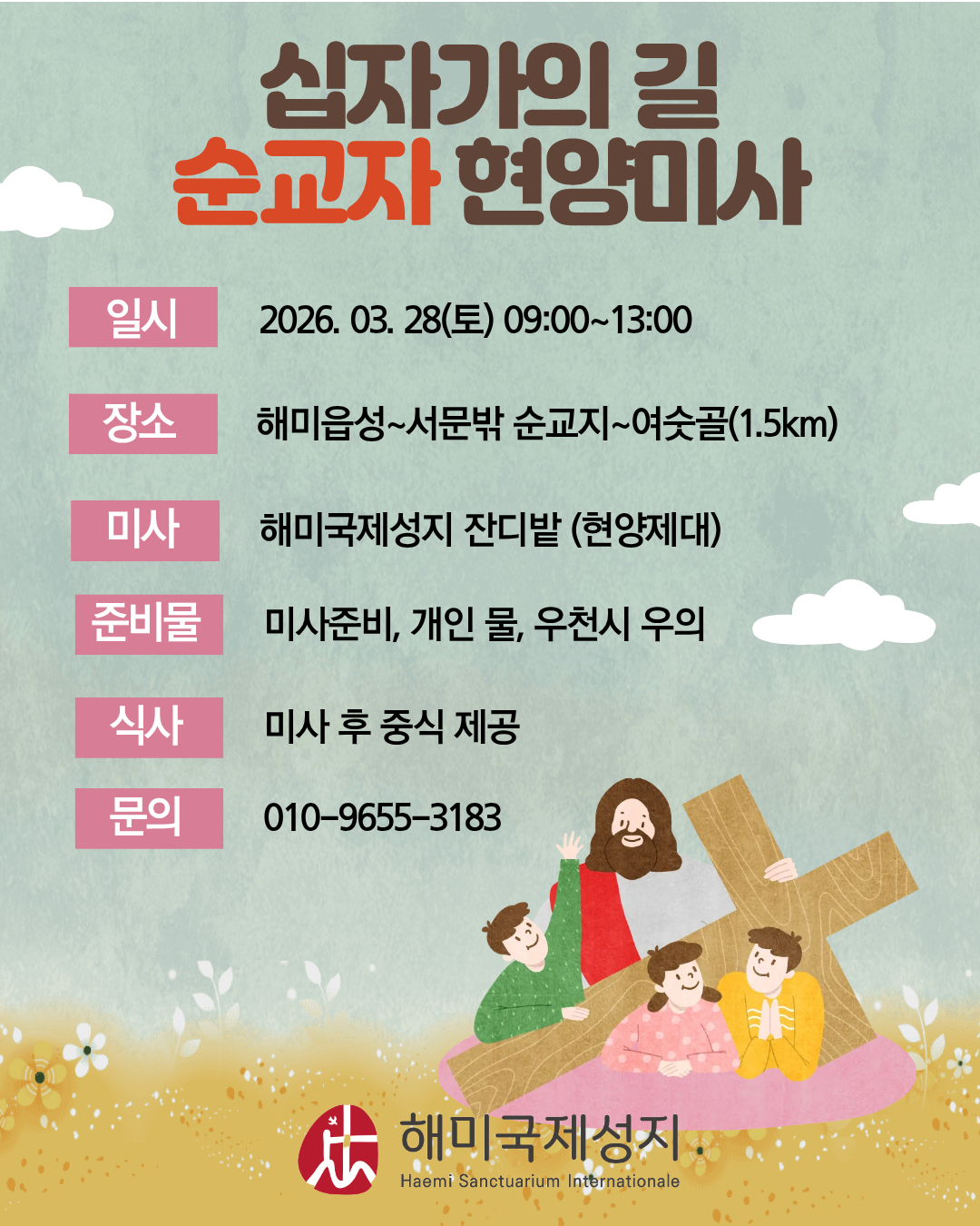 해미국제성지 '십자가의 길'과 현양미사 일 시: 2026년 3월 28일(토) 09:00~13:00 장 소: 해미읍성~서문밖 순교지~여숫골(1.5km) 미 사: 해미국제성지 잔디밭 (현양제대) 코 스: 09:00 해미읍성 도착 ~ 십자가의 길 11:00~12:30 순교자 현양미사 ※준비물: 미사준비, 개인 물, 우천시 우의 / 미사후 중식 제공(예약 접수) ※문의: ☎ 010-9655-3183 |